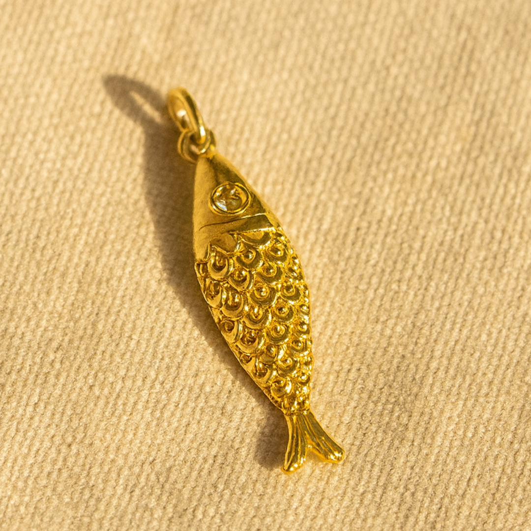 Este charm representa la fluidez, la abundancia y la intuición. Diseñado en forma de pez de 3.5 cm de largo x 1 cm de ancho, tiene un cristal blanco como ojo, simboliza la energía vital y la prosperidad.