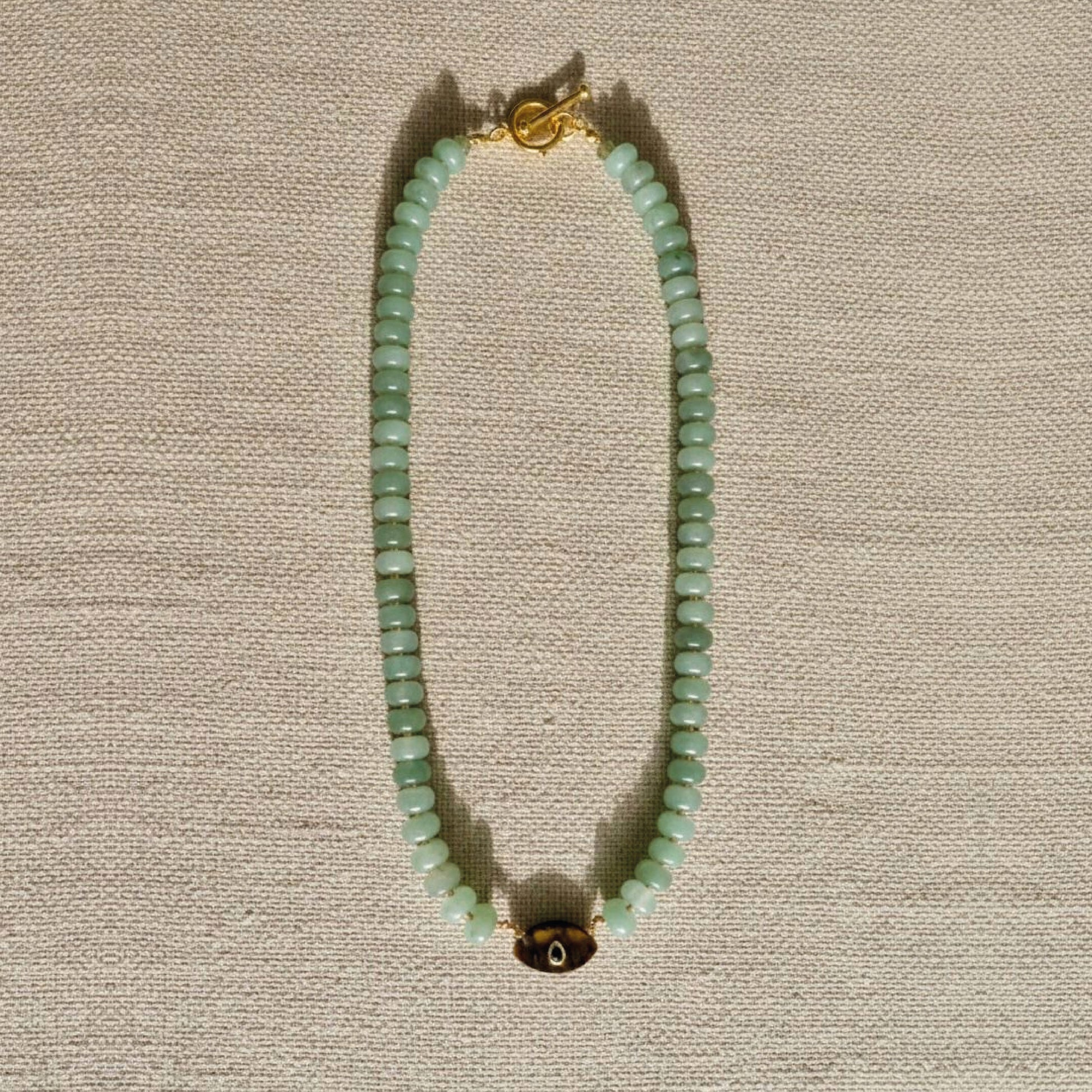 Collar de aventurinas verdes de 55 cm, con un dije central de ojo protector en ojo de tigre y una lágrima de circón ámbar. Incluye broche multicharm, que permite usar el collar de forma reversible: con el dije al frente o dejando que las aventurinas sean las protagonistas, además de poder personalizarlo con otros dijes.