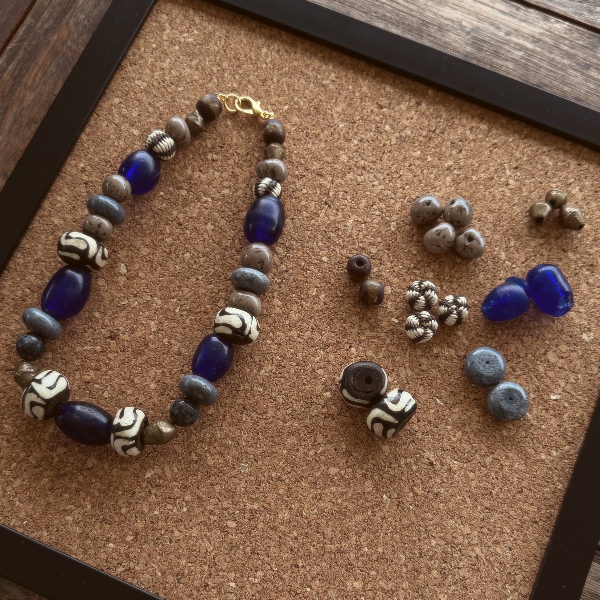 Collar elaborado con coral azul, fibra de coco, tagua, obsidiana, vidrio azul reciclado y latón africano. Una mezcla de minerales y metales en tonos intensos que evocan la riqueza de la tierra.