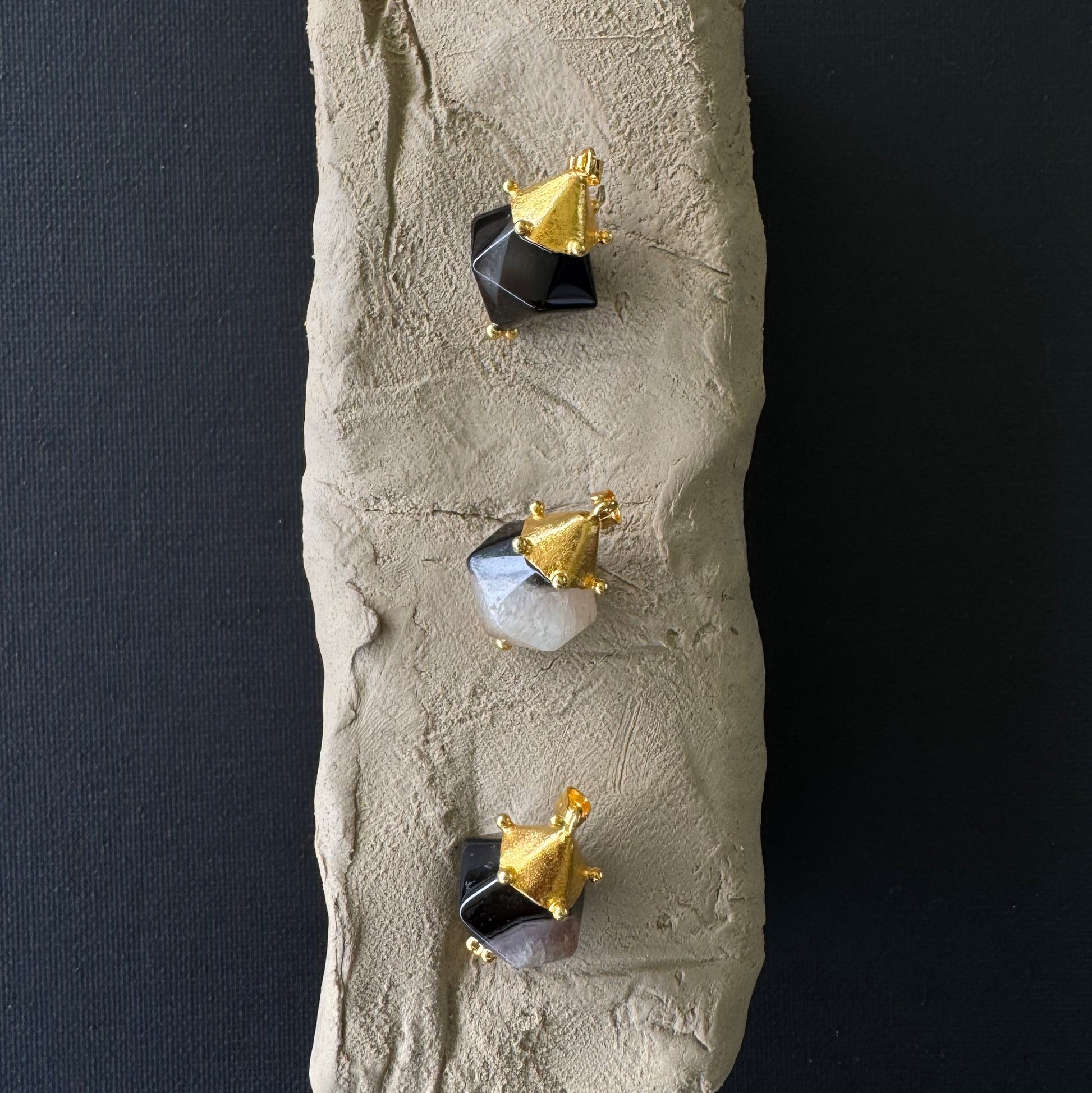 Charm de cuarzo blanco y negro con herraje en bronce y baño de oro de 24k.