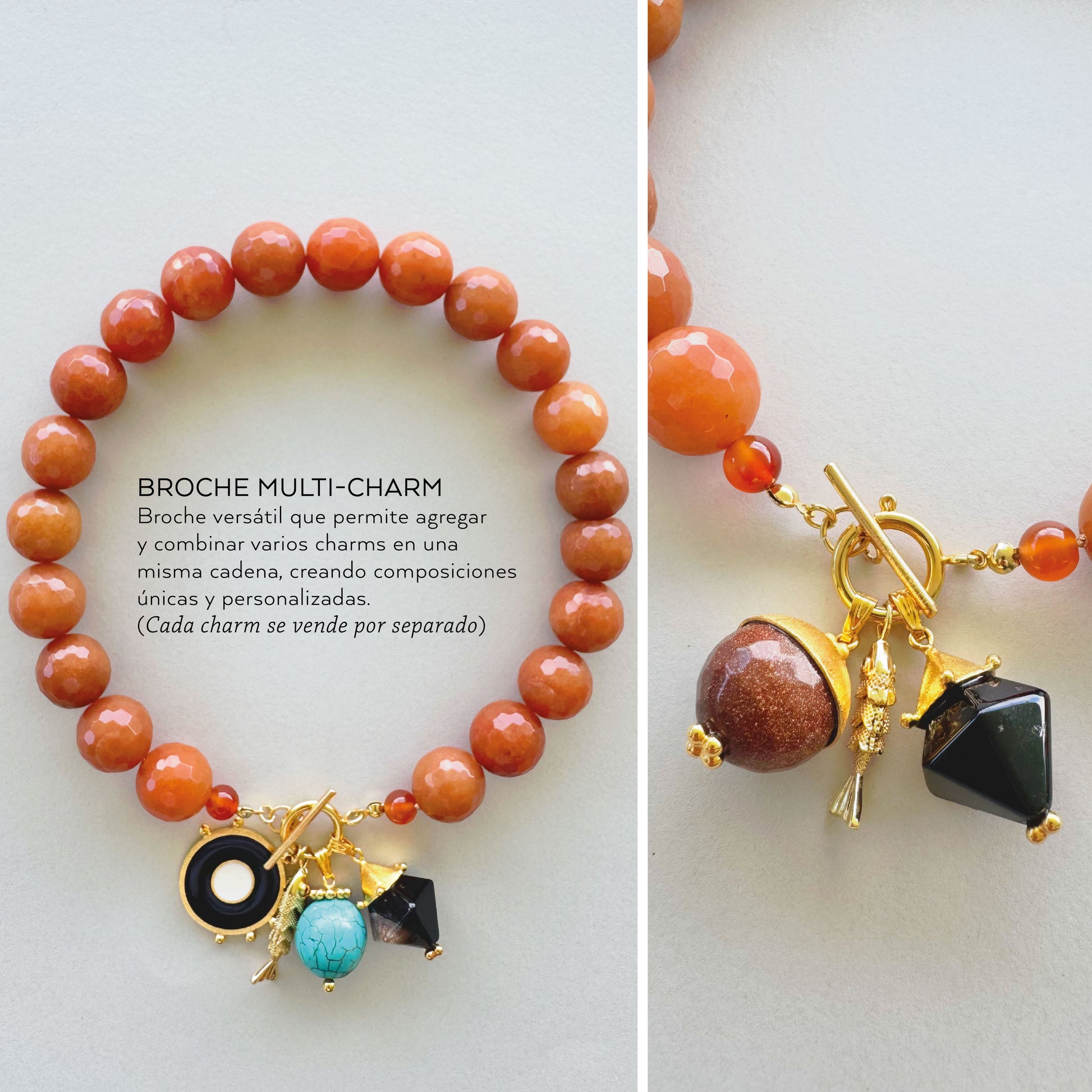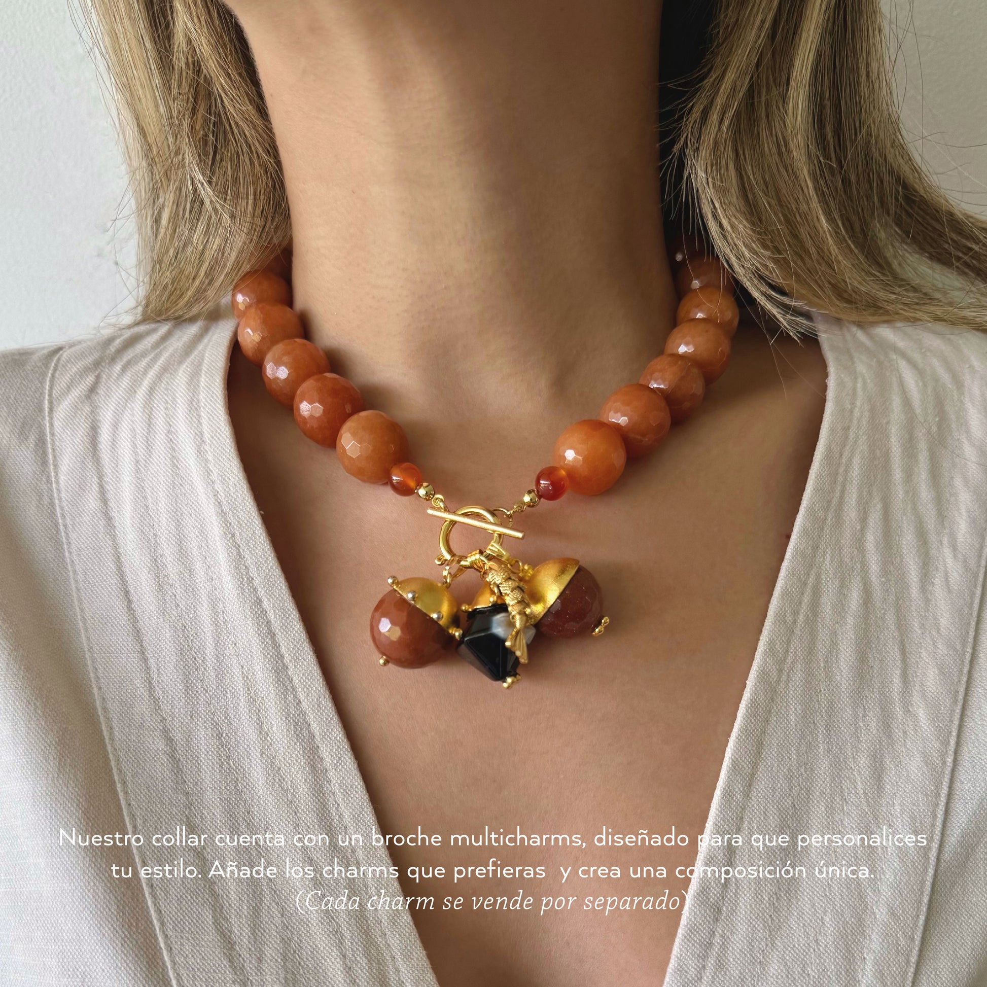 Este collar está compuesto por esferas de aventurina amarilla de 18 mm, cuidadosamente pulidas para reflejar una luz cálida y natural. Su diseño de 45 cm incorpora un broche tipo T multicharm, pensado para personalizar con dijes y amuletos, puedes llevarlo hacia adelante, o hacia atrás, dejando que las piedras sean las protagonistas.