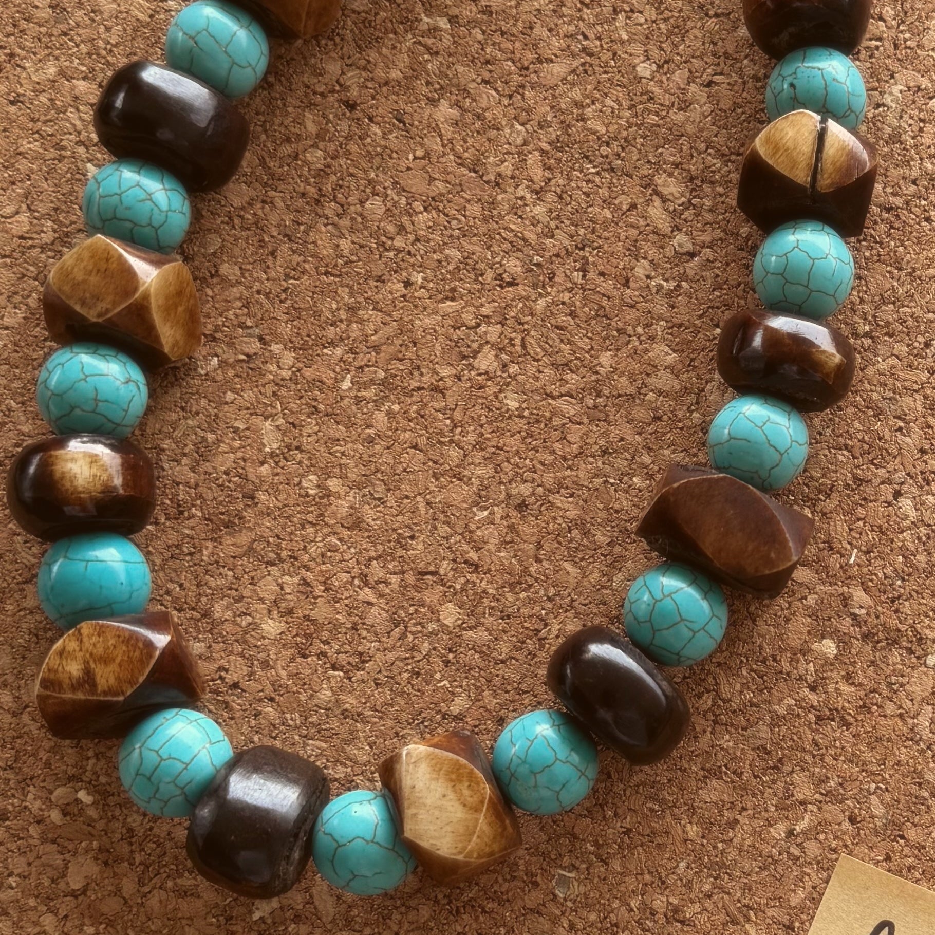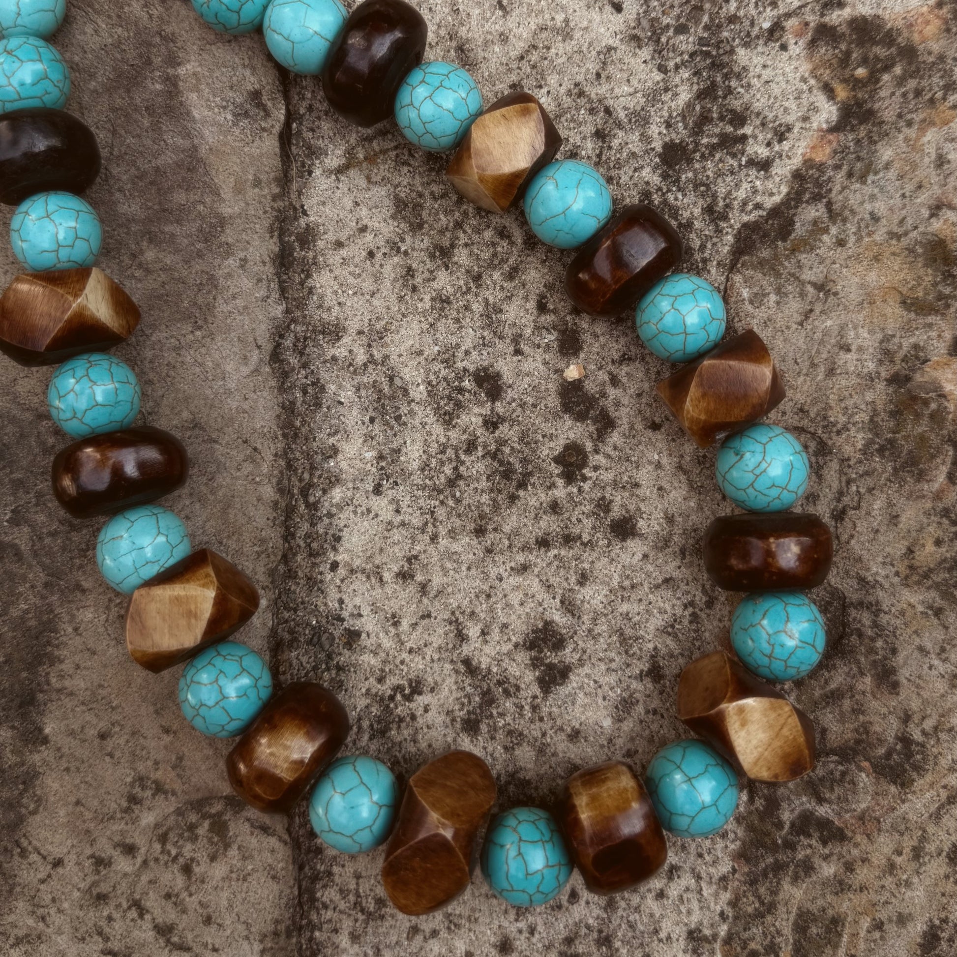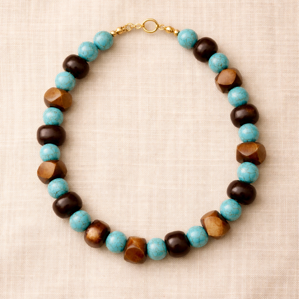 Collar elaborado con turquesas y fibra de coco, inspirado en los oasis que emergen en medio del desierto. Los tonos azules evocan agua y frescura, mientras los materiales naturales conectan con la tierra.