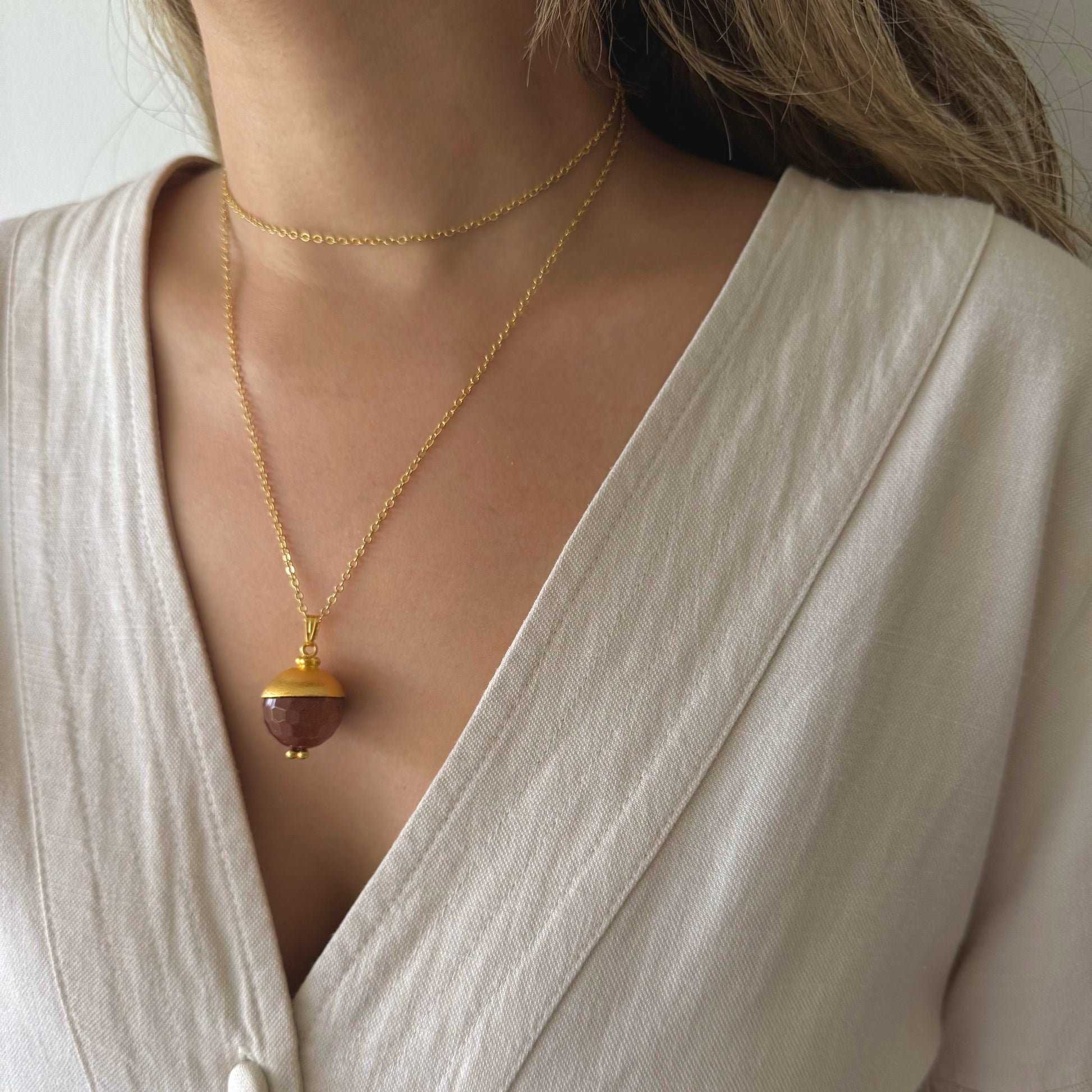 Este collar une la fuerza simbólica del Charm Copper Dust con la delicadeza de una cadena Slim larga de 85 cm, creando una pieza elegante, versátil y llena de intención. Su diseño alargado aporta un toque contemporáneo y estilizado, ideal para llevar sola o como parte de un layering sofisticado. A esta cadena se le pueden dar hasta dos vueltas. El Charm Copper Dust, elaborado en piedra Lluvia de Estrellas con herraje en bronce bañado en oro de 24k, se distingue por su forma circular facetada, que captura la luz como un pequeño universo suspendido.