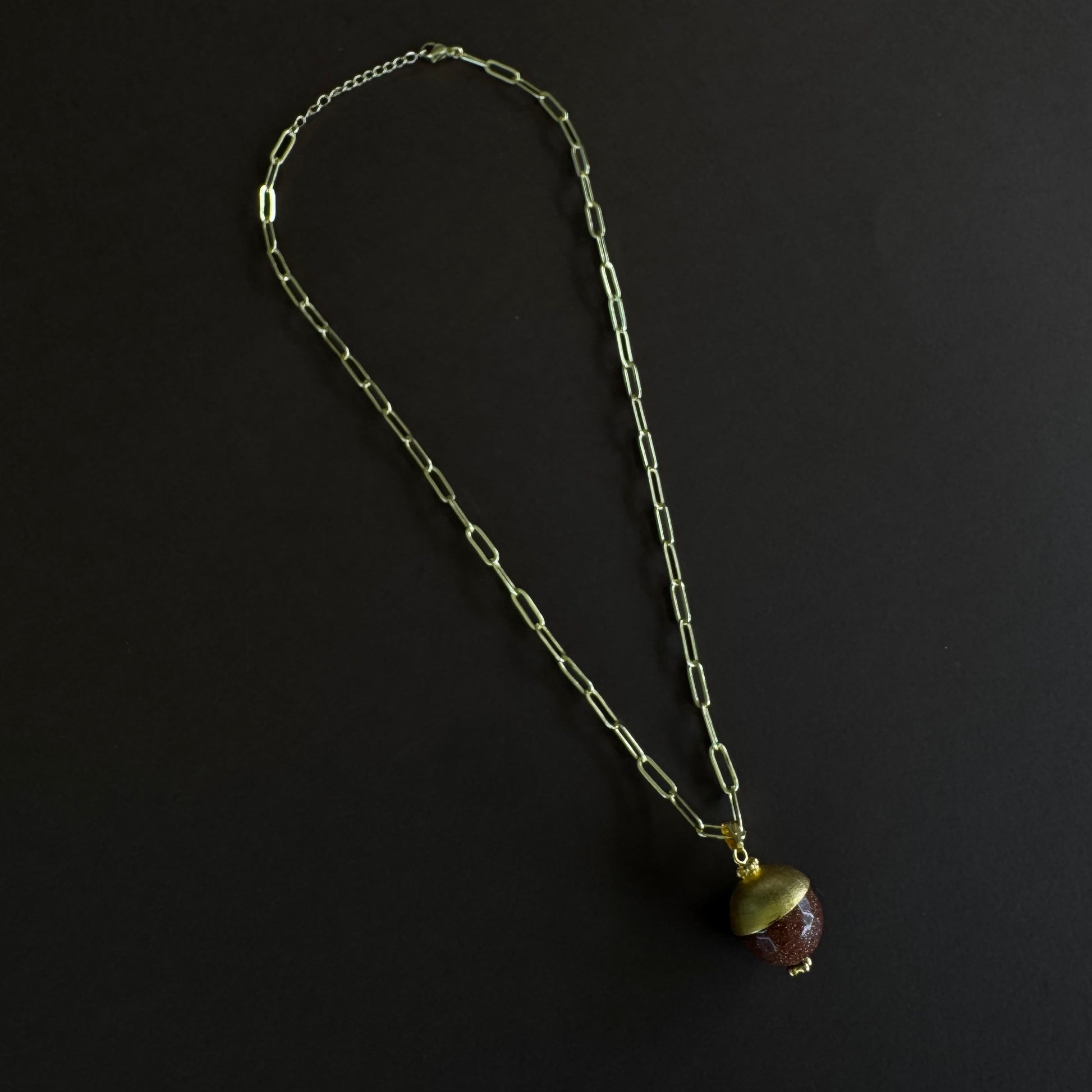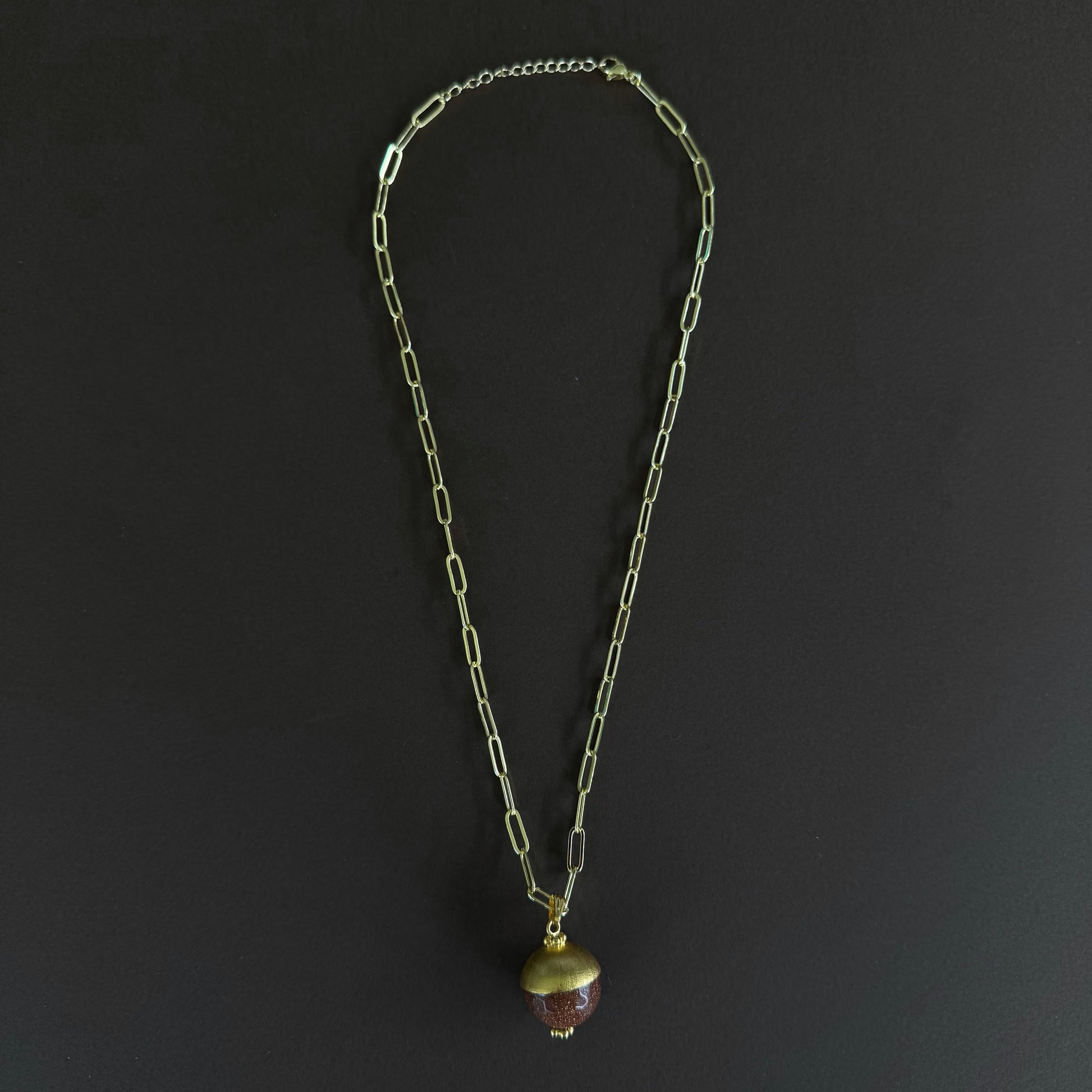 El Charm Copper Dust, elaborado en piedra Lluvia de Estrellas con herraje en bronce bañado en oro de 24k, se distingue por su forma circular facetada, que captura la luz como un pequeño universo suspendido. El herraje orgánico, adornado con balines soldados, aporta armonía y equilibrio visual, mientras su sistema de enganche permite adaptarlo a distintas cadenas y combinarlo con otros charms para crear amuletos personalizados.