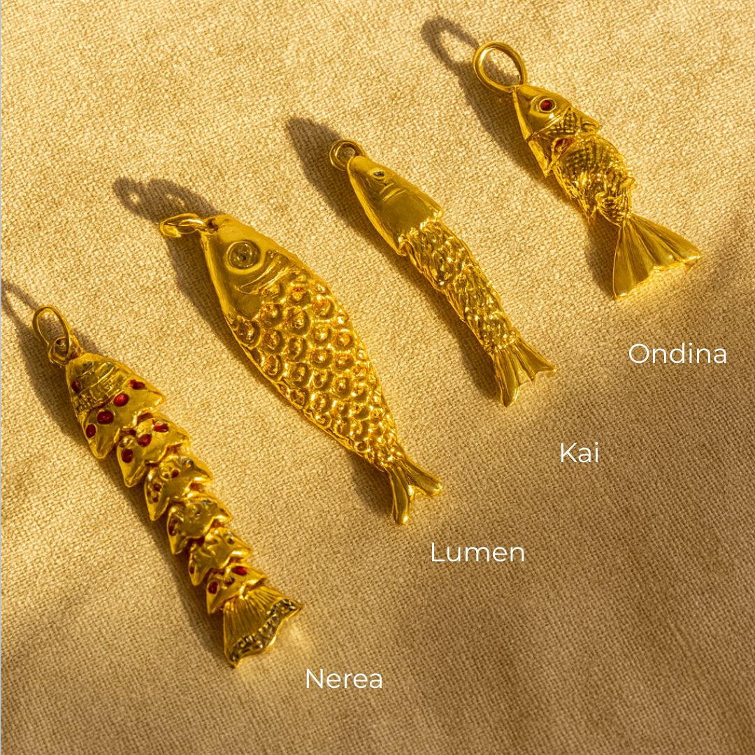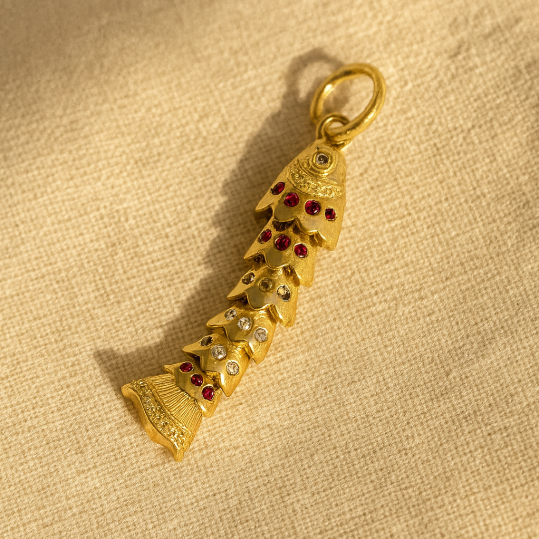 Este charm representa la fluidez, la abundancia y la intuición. Diseñado en forma de pez de 4 cm de largo, su cuerpo articulado permite un movimiento sutil que da vida a la pieza, con cristales blancos, rosados y verdes que simbolizan la energía vital y la prosperidad.